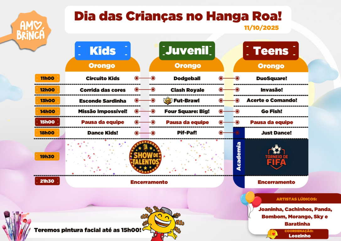 De noite a turma volta das 18h até 22h, garantindo uma programação cheia de brincadeiras.