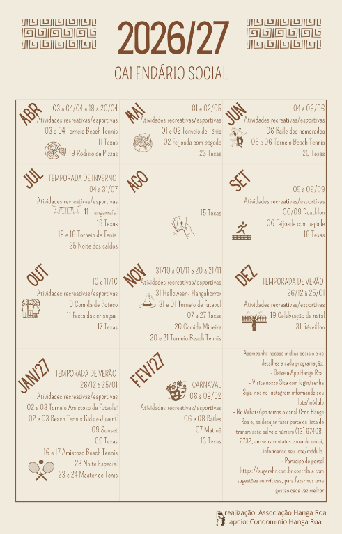 Vem muita diversão por aí! Apresentamos nosso cronograma de eventos e torneios. Os detalhes de horários e atrações serão divulgados em nossas redes sociais conforme as datas se aproximarem.